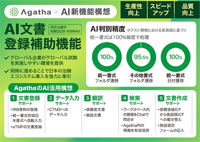 AI新機能の第一弾として今年7月1日に当社クラウドソリューション「Agatha」において、文書登録業務を支援する「文書登録補助機能」をリリースした。治験における文書登録は、製薬企業のCRAや医療機関スタッフにとって煩雑な作業である中、正確性やスピードが求められる。