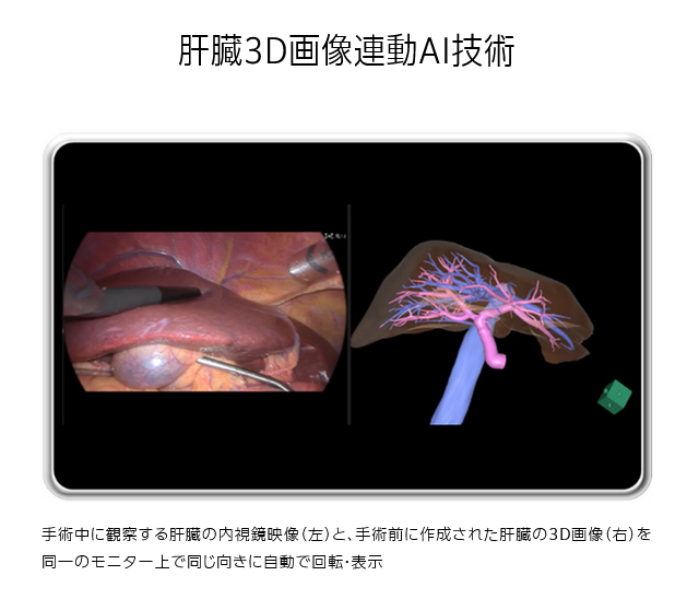 「肝臓3D画像連動AI技術」は、手術中に観察する内視鏡映像から肝臓の向きを解析し、事前に作成した肝臓の3D画像を内視鏡映像と同じ向きに自動で回転させ、同一モニター上で参照できるようにすることで、肝臓の表面からは観察することが難しい、肝臓内部の血管構造や腫瘍の位置などの把握をサポートする。