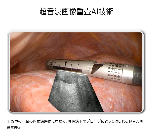 近年、患者への負担が少ない、腹部に小さな穴をあけて行う「腹腔鏡下手術」やロボットを使った「ロボット支援下手術」の手術件数が増えている。そうした手術では、肝臓の表面からは見えない血管や腫瘍の位置を確認するために、術中超音波検査が行われているが、医師は手術中に観察する内視鏡映像と、超音波画像を同時にそれぞれ別の画面で見る必要があった。