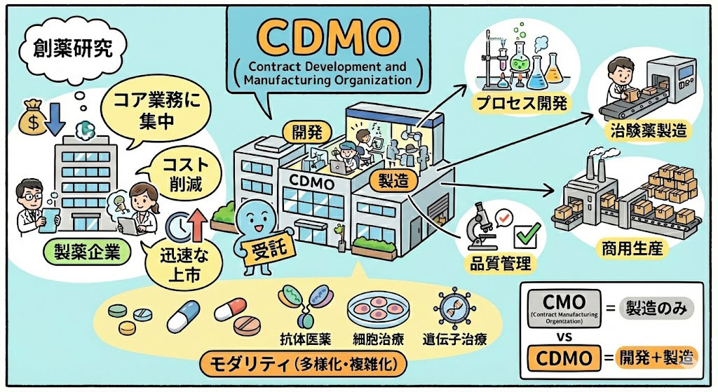 従来の製薬ビジネスにおいて、製薬会社は創薬研究から治験薬製造、臨床開発、申請、そして商用生産までを自社で完結させるのが一般的でした。しかし、医薬品のモダリティが高度化し、製造プロセスが複雑になるにつれて、外部の専門性を活用する必要性が高まりました。ここで登場したのがCDMOです。