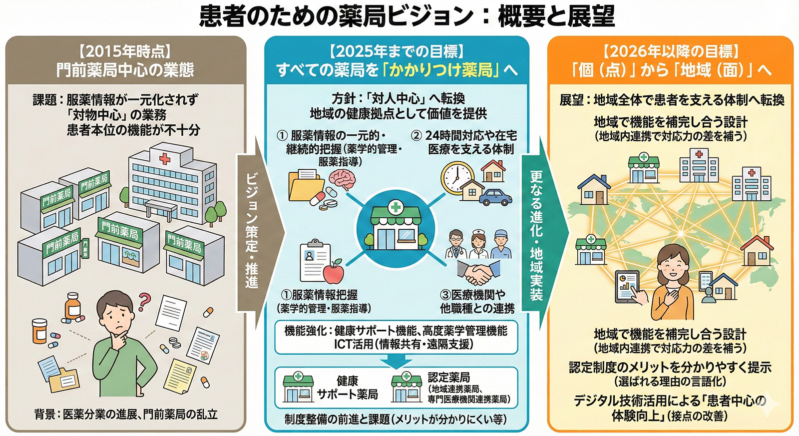 このビジョンの目的は、従来の「対物中心」の業務から「対人中心」へと転換し、患者の薬物療法を継続的に支える薬局の役割を再定義することにあります。これにより、薬局は単なる調剤拠点ではなく、地域における患者支援の中核として機能することが期待されています。