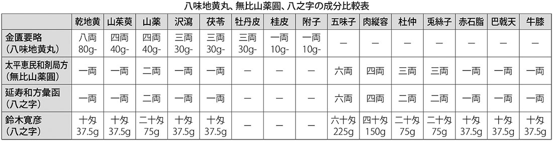 無比山薬圓は『金匱要略』の八味地黄丸をもとに改良された薬であり、12種の生薬(地黄、山茱萸、山薬、茯苓、沢瀉、五味子、赤石脂、杜仲、兎絲子、巴戟天、肉蓉、牛膝)からなる。八味地黄丸から牡丹皮・桂皮・附子を除き、健胃・滋養強壮薬を加えた構成である。