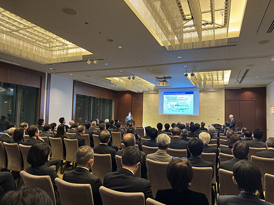 特別講演会は賀詞交歓会の前に45分程度行われ、厚生労働省医政局総務課医療国際展開推進室室長の高山研氏と、株式会社野村総合研究所上級コンサルタントの小池純司氏が事業の国際展開の支援策等について講演した。