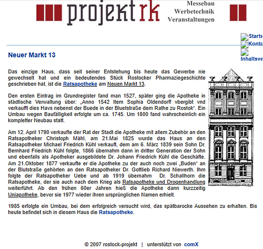 その結果、ロストック市の2007年の都市計画の中にニーウェルトの姓名が記載されていることが分かった。市内の有名な通り(イノアー・マルクト13番地)に昔からのビル(写真1)の1階に1542年から開局している市営薬局(Ratsapotheke)について書かれてあり、この伝統ある薬局が何人かの経営者に買い取られていた変遷が明記されている。