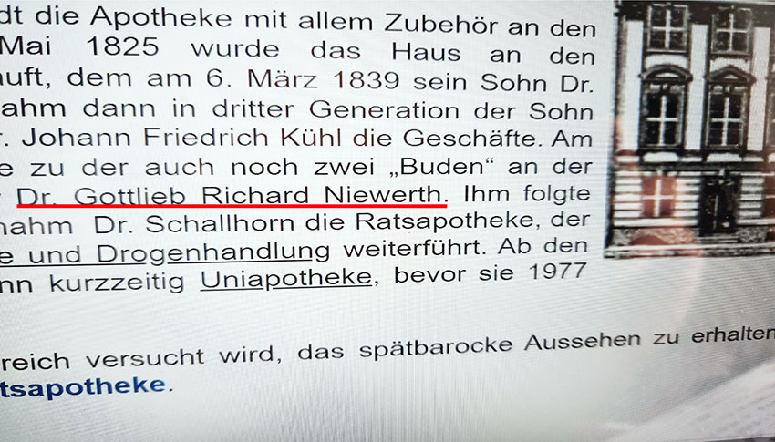 その中に「1877年10月21日、市の薬剤師Gottlieb Richard Niewerthが買い上げた」と書かれてあり、初めてフルネームが分かった(写真2)。Richard は英語読みではリチャードとなるが、ドイツ語ではリヒャルトと読む。