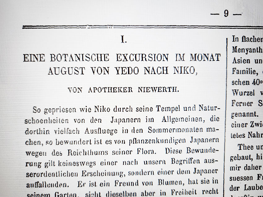 別の調査から、ニーウェルトはドイツの学術雑誌「ドイツ人社会のための東アジアの自然・民俗学」に、8月の江戸から日光までの日本の植物を観察した論文を3ページほどにわたって書いている(Niewerth R. Eine botanishe Excursion im Monat August von Yedo nach Niko. 1873-76;Heft 7:9-11)(写真3
