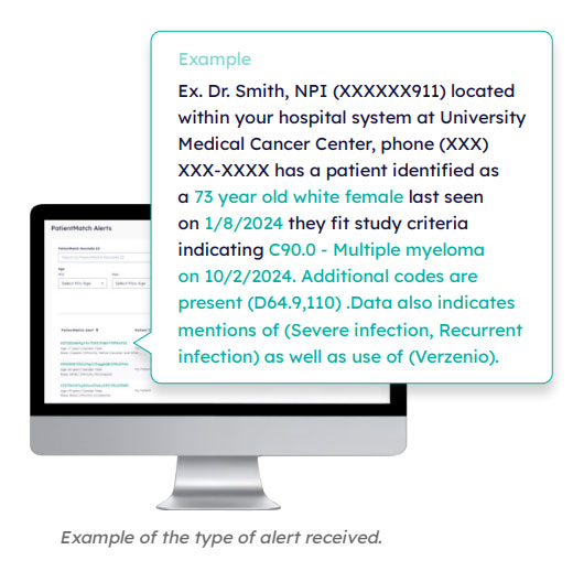 PatientMatch の最大の特徴は、検査結果やバイオマーカーなど、患者が治験の対象となりうるデータを取得した瞬間に、治験責任医師やサイトスタッフに“自動通知”する点です。