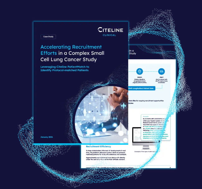 小細胞肺がんの臨床試験では、従来の募集手法では適格患者の発見が難しく、登録の遅延が問題となっていました。そこでスポンサーは Citeline PatientMatch を導入し、EMR・検査データ・オープンクレームを統合したリアルワールドデータとカスタムアルゴリズムにより、プロトコル適合患者を自動で特定できる体制を構築しました。この仕組みにより、医療行動をリアルタイムで検知し、適格と考えられる患者が見つかった際にサイトへ即時通知できるようになりました。導入後1週間以内に高品質の紹介が増加し、screen-fail が減少したことでランダム化までのプロセスが加速し、最終的には米国でランダム化された患者の20%が PatientMatch を通じて特定される成果につながりました。