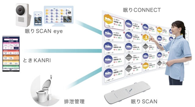 「睡眠・覚醒・起き上がり・離床」といった睡眠状態の変化や、就床時の「心拍数・呼吸数」が、「眠りCONNECT」と連携してPCや携帯端末に表示されるため、利用者の状態に合わせたケアが可能となっている。例えば、利用者が覚醒しているタイミングでのおむつ交換やトイレへの誘導を行うことで、睡眠を妨げにくいケアにつながる。