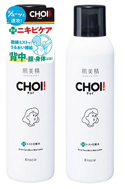 そうした中で同社は、“気になる肌悩み、チョイッとケア!”の「肌美精CHOI」シリーズから、逆さまにしても使えるスプレータイプで、誰でも簡単に背中のニキビケアができる「薬用ミスト化粧水」を発売し、顧客の肌悩みにデイリーに対応する。
