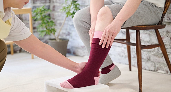 同製品は、高齢者の身体的特徴と座位時間が長くなりがちな生活様式に寄り添い、高齢者向けの「サイズ設計」で的確にフィットすることが特長となっている。高齢者特有の下肢形状(青壮年期と比較して膝下丈が短く、足首とふくらはぎの周径バランスも異なるなど)に配慮した専用設計を採用している。装着中に下肢の周径が変化しても圧迫圧が維持されるよう適応範囲を広く設計されており、一足を長く履き続けることができる。