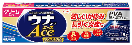 ウナコーワエースプレミアムは、抗炎症成分のアンテドラッグステロイドのPVA(プレドニゾロン吉草酸エステル酢酸エステル)を最大濃度の0.3%配合し、赤み・腫れなどの炎症を治療する。