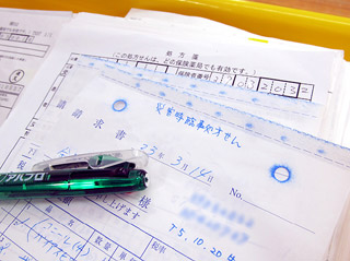 震災後は、普段、来局しない患者が多く押しかけたこともあって、新たな薬歴作成は後回しになった。ようやく入力ができる状況になったのは、4月中旬以降だという。調剤録も、混乱の極みだった3月分は未だに整理できず、調剤済み処方箋が山になっている。中には「請求書」の用紙を緊急“処方箋”としたものもあり、当時の混乱をうかがわせる。