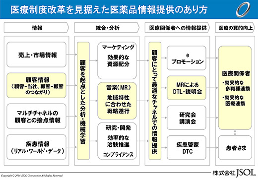 JSOLは、分析ソリューション技術を強みに、製薬企業の質の高い情報提供活動を支援する。製薬企業が集積した膨大な情報から、ターゲットとする医師に対して最も効果が高いと思われるアプローチ方法を導き出し、営業現場での効果検証を繰り返し、より訴求力の高い手法に仕上げていく。同社が提供するソリューションは、企画段階から製薬企業の営業・マーケティング部門と協業し、問題点の可視化から営業生産性向上に必要な業務・IT施策を一緒に検討していくことにある。