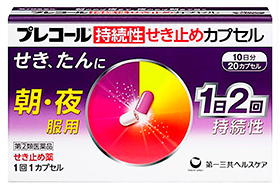 また、1日2回服用タイプを特徴とする「プレコール」ブランドからは、「プレコール持続性せき止めカプセル」(指定第2類医薬品)の包装規格追加品として、既存の10カプセル入りに加えて、新たに20カプセル入りを新発売した。パッケージについても、総合かぜ薬「プレコール持続性カプセル」に合わせた統一感のあるデザインに一新している。