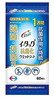 「イータック抗菌化ウエットシート」の主成分「イータック」は、広島大学大学院医歯薬保健学研究科の二川浩樹教授により開発された特許取得の持続型抗菌成分である。拭いた箇所に「イータック」の接着成分が化学結合し、抗菌成分が対象物表面に固定化されることで抗菌作用が1週間持続する。