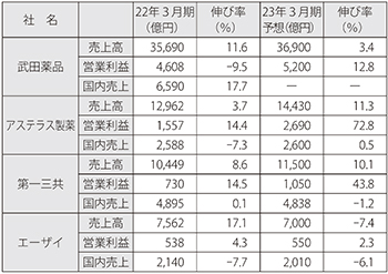 武田薬品、第一三共、アステラス製薬、エーザイの国内上場大手製薬4社の2022年3月期決算が13日に出揃った。4社とも増収、武田薬品を除く3社が営業増益だった。コロナ禍前の19年度実績を凌ぐ勢いを見せ、各社とも成長軌道に乗せた。牽引したのはグローバル戦略品。しかし国内業績は、薬価改定の影響などで低い伸びか減収と対照的だった。薬価改定のあった22年度もその傾向が続く見通し。日本市場の魅力、投資優先度の低下を懸念する声が上がっている。コロナ後の事業モデルの変革も迫られている。決算の数字の裏で、今後の成長に大きな課題を突き付けられている(表参照)